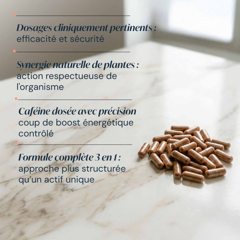 L’association de ces quatre plantes agit sur trois leviers clés de la perte de poids : énergie, métabolisme, contrôle de l’appétit. Un complément complet pour accompagner votre mode de vie, sans compromis.