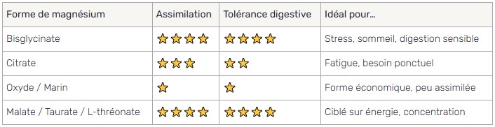 Toutes les formes de magnésium ne se valent pas. Certaines sont peu assimilées et provoquent des troubles digestifs comme des ballonnements ou des diarrhées. Voici un petit comparatif utile :