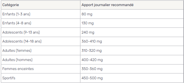 Selon les recommandations de l’Agence nationale de sécurité sanitaire (ANSES), l’apport quotidien recommandé varie selon l’âge et le sexe. Les apports quotidiens en magnésium varient entre 300 et 420 mg selon les profils.